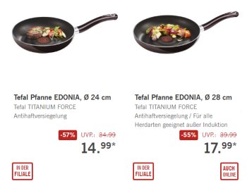 Bei Lidl sind ab sofort zwei Tefal-Pfannen zu Schnäppchenpreisen zu haben. Eine davon gibt es auch im Onlineshop: Die „Tefal Edonia“ mit einem Durchmesser von 28 Zentimetern ist von 39,99 auf 17,99 Euro reduziert worden.