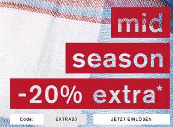 Beim Mid-Season-Sale von s.Oliver sind jetzt alle reduzierten Teile nochmals 20 Prozent günstiger zu haben. Der Gutschein ist bis zum 1. Mai 2019 einlösbar.