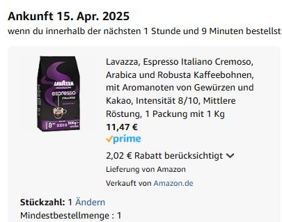 Der „Lavazza Espresso Italiano Cremoso“ für 12,14 Euro im Sparabo ist nur für kurze Zeit zum Aktionspreis zu haben, solange Vorrat reicht. Discountfans können obendrein einen Coupon über fünf Prozent Rabatt einlösen und über das Abo weitere fünf bis 15 Prozent sparen, sodass Endpreise von 11,47 für den Markenkaffee möglich (siehe Screenshot vom Warenkorb) sind – günstiger war der Lavazza in den letzten zwei Jahren nicht zu haben. Das Sparabo kann jederzeit pausiert oder beendet werden.
