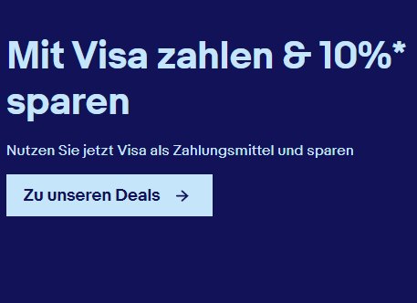 Wer jetzt bei Ebay einkauft und mit der Visacard zahlt, erhält einen Rabatt von zehn Prozent. Die Aktion läuft nur bis Ende Juni und ist obendrein auf zehn Euro Preisabschlag gedeckelt.