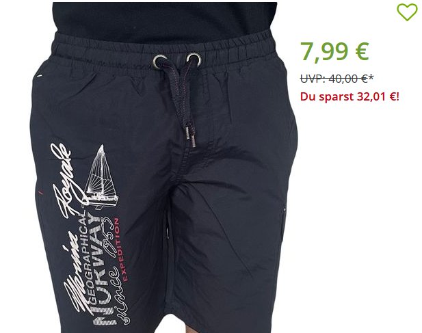 Die Herren-Badehosen von „Geographical Norway“ für 7,99 Euro sind nur für wenige Tage zum Aktionspreis zu haben, solange Vorrat reicht. Verfügbar sind nur die Größen M und L. Die Quara Herren-Badeshorts in Navy verfügen über einen elastischen Bund mit Bindeband, mehrere Taschen (seitlich, Gesäß, am Bein) und ein Netzfutter.