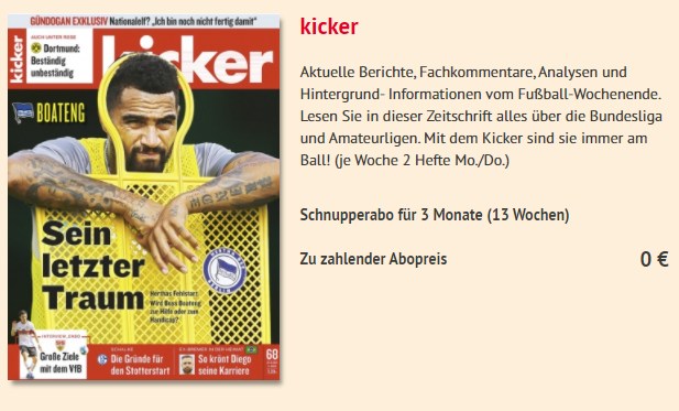 Die Drei Monate „Kicker“ zum Nulltarif sind nur bis zum 19. September verfügbar, solange Kontingent reicht. Normalerweise kostet die Zeitschrift im Jahresabo 296,40 Euro.