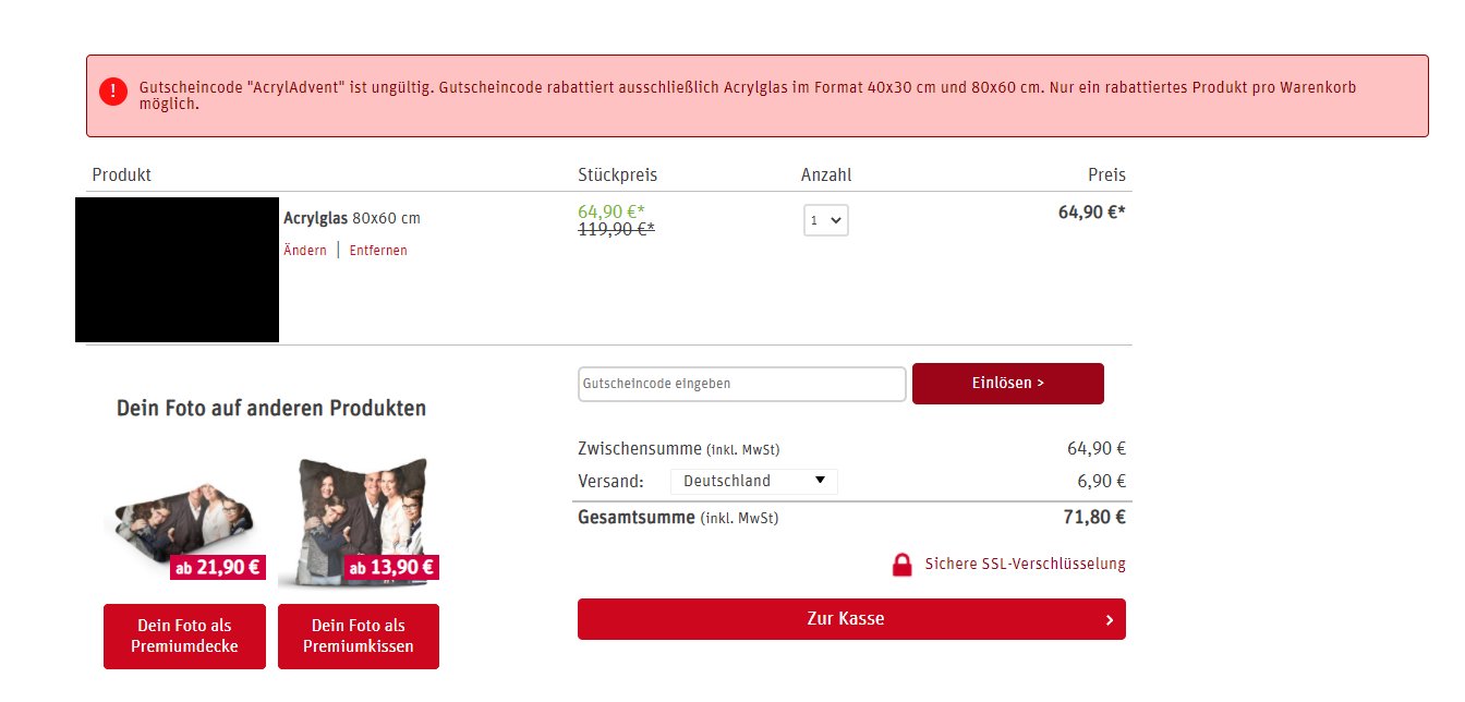 Heute morgen hat der ursprüngliche Code endlich funktioniert. Das Acrylglasbild kann also zum Schnäppchenpreis bestellt werden.