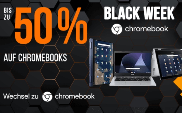 Im Rahmen der aktuell laufenden „Black Week“ von Notebooksbilliger (NBB) sind jetzt vier Chromebooks zu Preisen ab 189 Euro frei Haus zu haben. Discountfans können den Preis um weitere 25 Euro drücken.