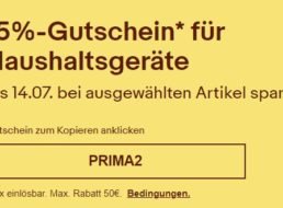Noch bis Mittwoch sind bei Ebay ausgewählte Haushaltsgeräte mit 15 Prozent Extra-Rabatt zu haben. Mit dabei sind Ventilatoren, Klimageräte, Luftreiniger und Küchenmaschinen. Um den Haushalts-Rabatt von 15 Prozent bei Ebay zu erhalten, müssen Discountfans bei der Bestellung den Gutschein-Code PRIMA2(gültig bis 14.07.2021) eingeben. Das gilt für alle Produkte auf der Aktionsseite, der Discount ist allerdings […]