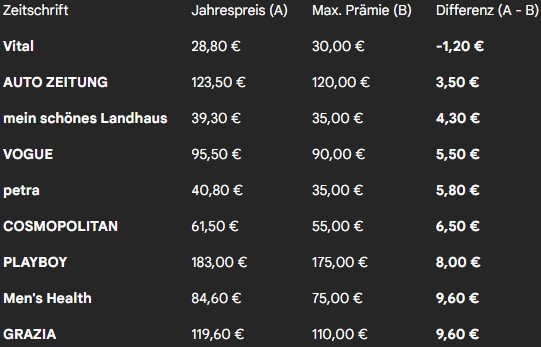 - manager magazin: Jahrespreis 132,00 € / Max. Prämie 95,00 € / PnP: 37,00 €