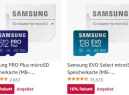 Mit der „Samsung PRO Plus microSD“ ist jetzt bei Amazon eine Speicherkarte mit 512 GByte für 49,99 Euro frei Haus zu haben. Die über 2600 Bewertungen fallen sehr gut aus. Die „Samsung PRO Plus microSD“ für 49,99 Euro frei Haus ist nur für wenige Tage zum Aktionspreis zu haben, solange Vorrat reicht. Die Übertragungsraten sind […]