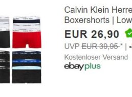 Via Ebay gibt es heute als „Wow! des Tages“ ein Dreierpack Boxershorts von „Calvin Klein“ für 26,90 Euro frei Haus. Zur Auswahl stehen drei Größen und vier verschiedene Sets. Das Dreierpack Boxershorts von Calvin Klein für 26,90 Euro ist nur bis Mittwoch Morgen verfügbar, solange Vorrat reicht. Die Markenwäsche gibt es in M, L und […]