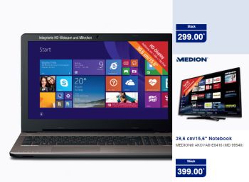 Mit dem Medion Akoya E6416 gibt es bei Aldi-Nord zwei Wochen nach der Premiere im Süden ein Einsteiger-Notebook für 399 Euro. Außerdem sind ab dem 26. März 2015 externe Festplatten, Smart-TVs und Telefone im Angebot.
