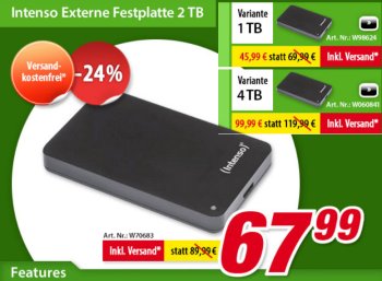 Bei Völkner sind derzeit drei verschiedene Externe Festplatten zu Aktionspreisen im Angebot. Doch nur bei einer unterbietet der Onlineshop preislich seine Konkurrenz: Das Modell mit vier TByte ist zum Bestpreis von 99,99 Euro frei Haus zu haben.